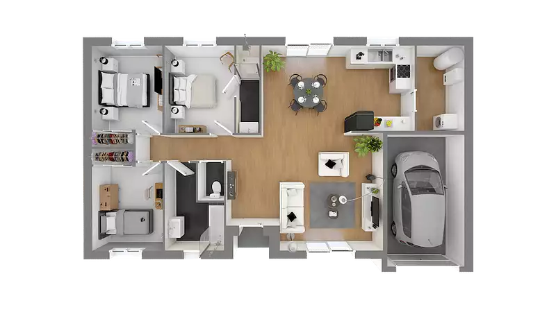 Ce modèle est conçu pour s'adapter parfaitement à votre parcelle, grâce à sa conception réversible qui permet d'optimiser l'orientation selon l'accès et l'ensoleillement, assurant ainsi une maison lumineuse et chaleureuse. La liaison entre l'intérieur et l'extérieur est soigneusement étudiée pour offrir un cadre de vie agréable et ouvert sur la nature.