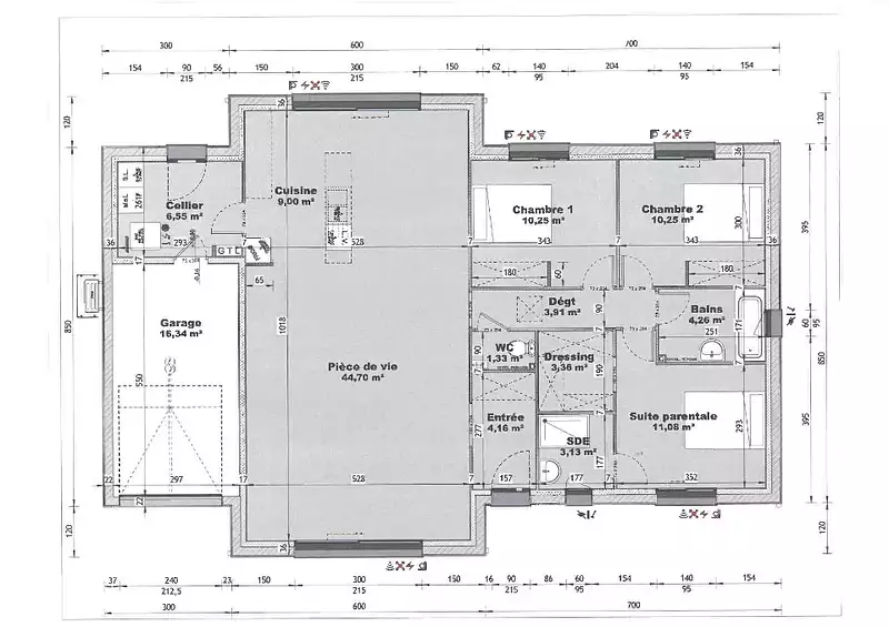 Terrain proposé par un partenaire foncier selon disponibilités et autorisation de publicité au prix de 55 000 €. Hors droit d'enregistrement et frais de notaire. Maison proposée, avec un contrat de construction de maison individuelle, dans le cadre de la loi du 19/12/1990, au prix de 260 000 € (Hors branchements et raccordements, papiers peints, peintures, revêtement de sol dans les chambres, qui sont chiffrés dans les travaux qui restent à charge du client. Tarif modifiable sans préavis). Étiquette énergie : A. Différents modèles disponibles pour ce terrain. Assurances et garanties du constructeur comprises (RC professionnelle, décennale, dommage ouvrage).