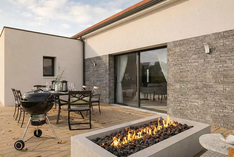Un plan en L qui change tout !. Cette maison séduit au premier regard par son architecture en L, qui structure l’espace avec fluidité et caractère. L’espace de vie s’ouvre naturellement sur l’extérieur, baigné de lumière et prêt à accueillir vos moments de partage. Le coin nuit, bien séparé, propose 4 chambres confortables et deux salles d’eau pour une vie de famille tout en douceur. Le cellier attenant à la cuisine et le garage intégré ajoutent une touche de praticité au quotidien. Un modèle pensé pour s’adapter à toutes les envies, avec un vrai potentiel de personnalisation. . Pour un confort optimal et conforme à la RE2025, cette maison dispose d’une PAC avec plancher chauffant et volets roulants électriques. À noter : Le prix indiqué exclut les revêtements de sol des chambres, la cuisine aménagée, la peinture, la décoration, les raccordements, les frais de notaire et l’assurance dommages-ouvrage. .