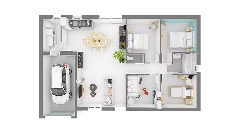 La Topaze se distingue par son plan en L, offrant une architecture originale et une disposition intérieure fonctionnelle. Ce design permet de séparer judicieusement les espaces de vie et les zones de nuit, garantissant ainsi intimité et convivialité à ses habitants. Le porche d'entrée, élégant et accueillant, mène à un intérieur soigneusement agencé, composé de 4 pièces lumineuses, dont 3 chambres confortables, répondant parfaitement aux besoins d'une famille.