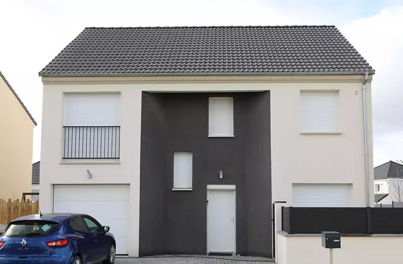 Les menuiseries sont en PVC de couleur blanche. La toiture est réalisée en tuiles béton double romane. Plusieurs couleurs d'enduit extérieur sont proposées.