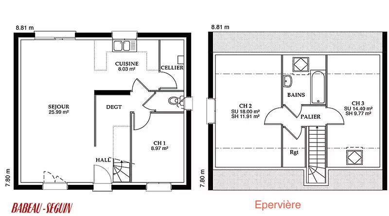L'Epervière est un modèle rare à étage qui propose une charpente fermette, optimisant ainsi l'usage de l'espace disponible. Grâce à cette conception ingénieuse, l'espace perdu des couloirs et autres dégagements est réduit au maximum, voire supprimé, pour offrir une maison à la fois économique et fonctionnelle.