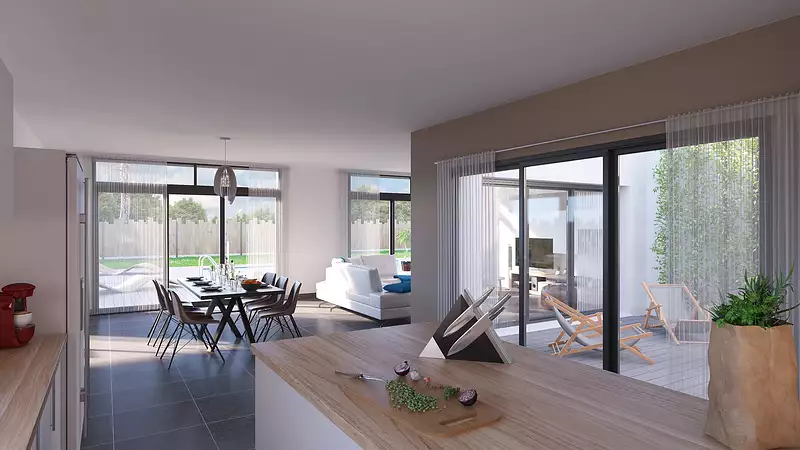 Vous serez séduits par l’aménagement de cette charmante maison de plain-pied avec son patio central de 17 m² qui sépare un espace de vie de plus de 63 m² baigné de lumière grâce à ses trois baies vitrées et l’espace nuit composé de 4 chambres dont 1 suite parentale avec dressing et salle de bains privative, une salle d’eau. Le garage communique également avec la cuisine grâce à un cellier. Pour vous assurer un confort de vie et conformément à la RE2025, nous avons choisi un mode de chauffage par PAC + plancher chauffant, volets roulants électriques. Prix hors peinture, décoration, revêtements de sol dans les chambres, cuisine équipée), frais de notaire, raccordements, dommage ouvrage. (Piscine non contractuelle, non comprise dans le prix).