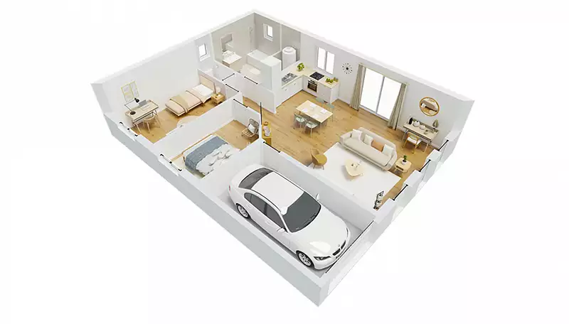 Le modèle Flavière intègre également un garage, répondant ainsi aux besoins de stationnement et de rangement de ses futurs occupants. Cette maison à prix réduit est une opportunité à ne pas manquer pour ceux qui recherchent une habitation moderne, économique et respectueuse de l'environnement.
