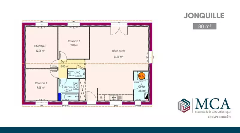 Cette maison de plain pied, dispose d'un hall d'entrée avec placard et wc séparés; une belle pièce de vie avec cuisine ouverte et cellier attenant, pour une surface totale d'environ 37m2. Le coin nuit est composé de 3 chambres, une salle de bains, et un WC séparé.