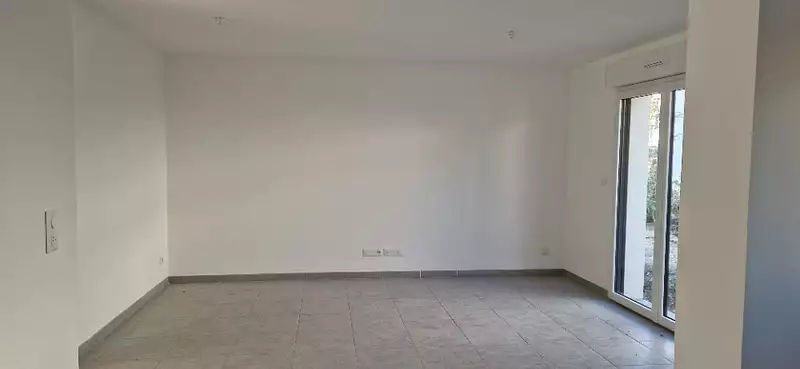 Terrasse béton 3.00 m x 3.00 m, jardin clos et engazonné. Stationnement aérien privatif.