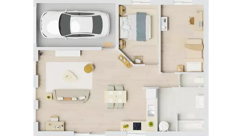 Les caractéristiques principales de la maison Okapia incluent un garage intégré, pratique pour le stationnement et le rangement, ainsi que des options de toiture à 2 pans ou 4 pans, selon vos préférences esthétiques.