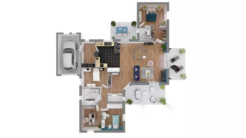 Avec une surface de 142 m², cette demeure offre de grands espaces et une architecture séduisante. Elle se compose de 3 chambres et de 4 pièces, dont un vaste séjour-salon-cuisine qui constitue le cœur de la maison. Le plan en L de la Camarsac permet une configuration intérieure très intéressante, avec un porche accueillant et un garage intégré pour plus de praticité.