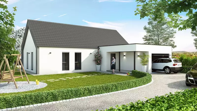 L'Atrium se distingue par ses 4 chambres spacieuses, promettant confort et intimité pour chaque membre de la famille, ainsi qu'une pièce de vie lumineuse et généreuse, véritable cœur de la maison où se mêlent convivialité et moments de partage. Le design extérieur, avec son garage accolé à toit plat, apporte une touche de modernité tout en conservant l'aspect rassurant des maisons traditionnelles.