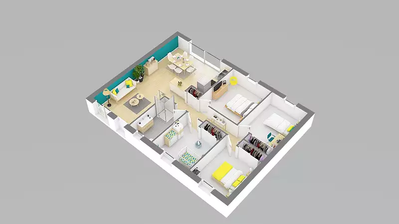 Le séjour traversant de cette maison permet une luminosité optimale et une adaptation parfaite à tous les types de terrains, y compris les terrains étroits. De plus, l'option d'enduit bi-ton, très demandée par nos clients, est disponible pour personnaliser l'esthétique de votre future maison.