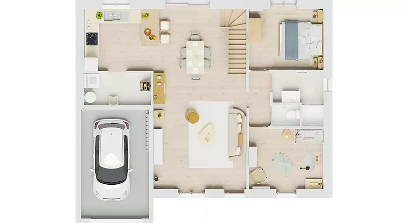 La Focus EVO est idéale pour tous ceux qui recherchent une maison complète à un prix compétitif. Elle comprend une grande pièce de jour traversante, 4 chambres, une salle de bain, et un garage de 15 m². Que vous soyez un jeune couple, un célibataire ou une famille en pleine expansion, cette maison saura s'adapter à vos besoins et à vos envies.