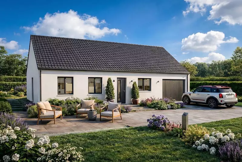 L'enduit bi-ton de la façade apporte une touche moderne et élégante à cette maison. De plus, les options les plus demandées par nos clients, comme les menuiseries en aluminium, sont disponibles pour personnaliser votre future habitation selon vos goûts.