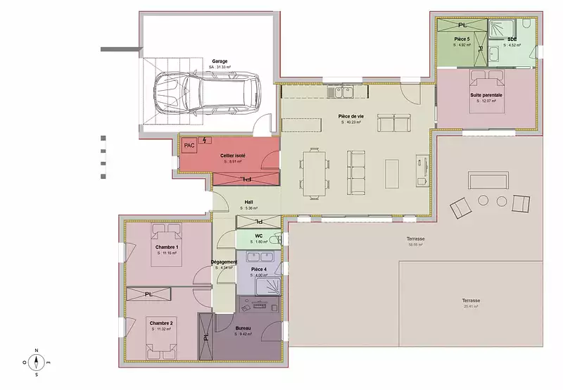 Elle se compose : d’une entrée avec vestiaire – une première partie nuit avec deux chambres (placards intégrés) et un bureau avec un accès jardin ; une belle pièce de vie de 40 m² double exposition et hauteur sous plafond de 2,70 ml, une suite parentale avec SdE privative, dressing. Un grand cellier et un garage de 31 m² permettant le stationnement d’un véhicule et deux roues.