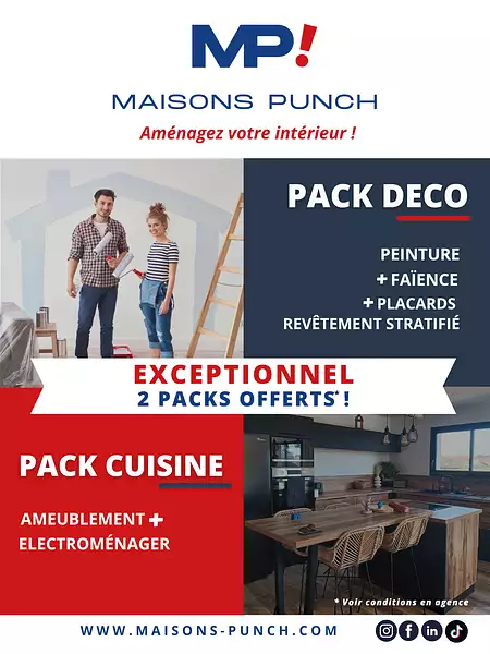 Terrain proposé et vendu par notre partenaire foncier selon disponibilités, le constructeur n’étant pas mandaté pour réaliser la vente du terrain. Prix terrain inclus : 77 110 € Frais de notaire non inclus : € Prix maison inclus : 140 890 € VRD non inclus : € Hors aménagements extérieurs (extensions, terrasse, piscine etc), papiers peints, peintures, moquettes dans les chambres (tarif en vigueur au 20 mai 2025, modifiable sans préavis, prix variables suivant les prestations souhaitées). Hors frais d’hypothèque. Différents modèles disponibles pour chaque terrain. Assurance RC professionnelle/décennale/dommage ouvrage groupe Aviva. Garantie de remboursement de l'acompte/livraison à prix et délai convenu CGI. Partenaire financier : à préciser Le numéro de TVA intracommunautaire : FR 14 498 627 272 00012 Contact : contact@maisons-punch.fr