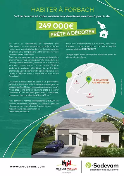 Contactez Sylvain BOUR (tél : 03-87-87-97-39) pour plus de renseignements sur la maison ou sur les démarches à suivre. Maisons Horizon Forbach est là pour vous accompagner dans tous vos projets immobiliers.