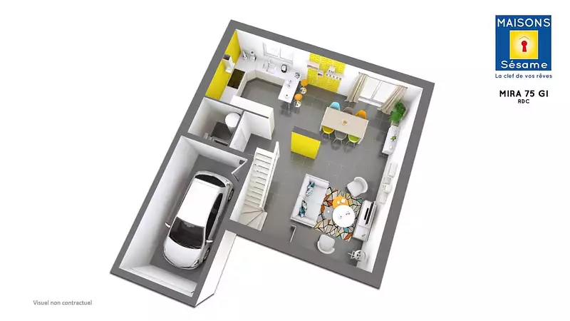 Le garage de 13 m² offre un espace de rangement ou de stationnement supplémentaire, complétant harmonieusement cet agencement intérieur. Ce modèle MIRA 75 GI est conçu pour répondre aux besoins d’une famille moderne, tout en maximisant chaque mètre carré.