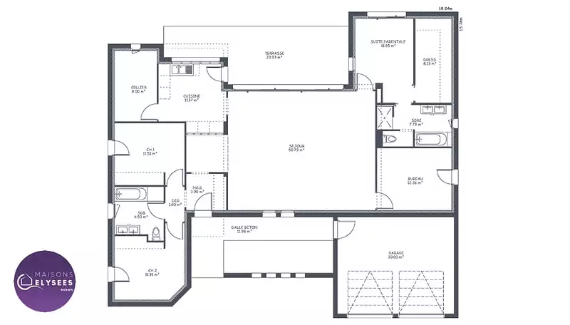 Le plan en H de la maison Efficium optimise l'espace et la luminosité, créant une atmosphère chaleureuse et conviviale. Le double garage permet de stationner aisément les véhicules de la famille, ajoutant une touche de praticité à ce bien d'exception.