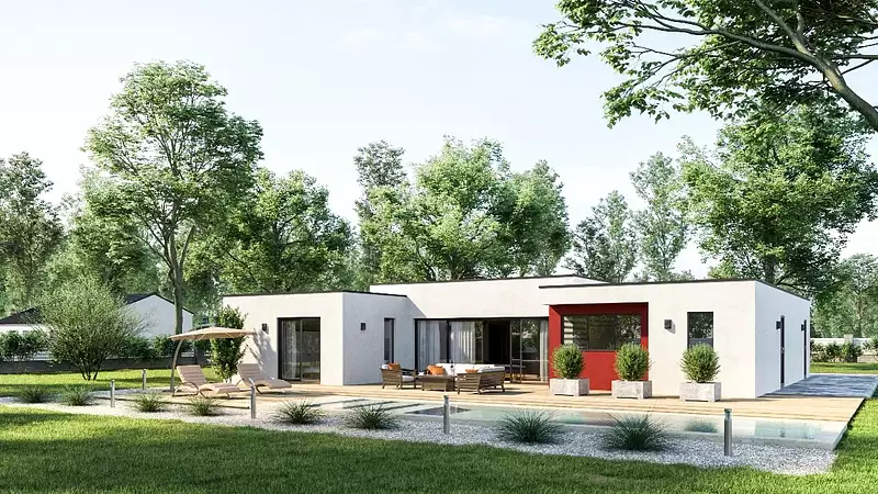 Cette villa à vivre, au design moderne, est également une maison basse consommation, conforme à la réglementation environnementale RE2020. Les menuiseries en aluminium, option très demandée par nos clients, ajoutent une touche d'élégance et de durabilité à cette construction.