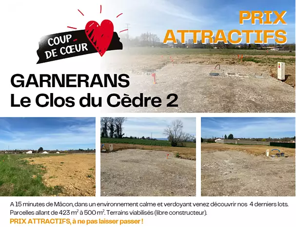 venez découvrir de très beaux terrains de 500 m² viabilisé, dans un petit lotissement de 6 lots, à 20 minutes de Belleville, à 5 minutes de St Didier sur Chalaronne, ou encore 18 minutes de Macon Loché TGV.