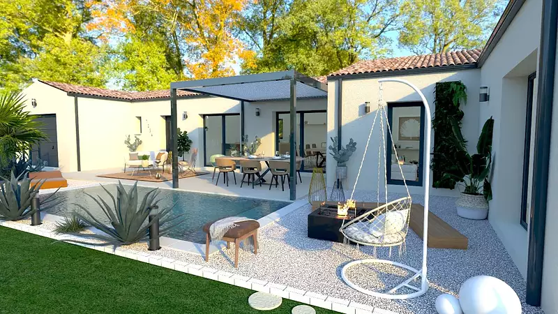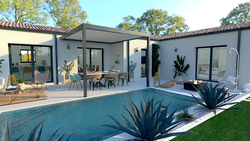 La localisation en campagne offre un cadre de vie paisible, tout en restant à proximité d'éléments importants tels que des arrêts de bus, des commerces, une école primaire et des espaces verts. L'exposition ouest du terrain permet d'apprécier des soirées ensoleillées dans un extérieur propice à la détente et aux loisirs. Ce projet saura séduire les familles en quête d'un lieu où se sentir bien, dans un environnement adapté aux enfants. Visuel d'illustration. Le modèle est totalement adaptable à vos envies et besoins et personnalisable grâce à de nombreuses options de finition. Nous consulter pour plus d’informations. Le prix affiché comprend le coût du terrain et de la construction hors frais de notaire et taxes. Les annonces de terrains constructibles sont sélectionnées auprès de nos partenaires fonciers selon disponibilités et autorisation de publicité en vue de construire une maison neuve avec un Contrat de Construction de Maison Individuelle dans le cadre de la loi du 19/12/1990. Ces derniers sont soit des professionnels dûment habilités à la transaction immobilière, soit des particuliers. Les terrains sélectionnés sont disponibles à la date de la première parution de l’annonce. En aucun cas Maisons ARLOGIS ou ses collaborateurs ne sont propriétaires des terrains, ne jouent un rôle d’intermédiation ou de négociation sur la transaction et ne participent à la vente. Prix indiqués par nos partenaires fonciers.