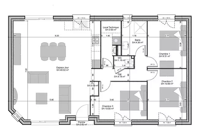 Conçue de plain-pied, elle compte trois chambres, une cuisine et une salle de bains. Cette maison est neuve.