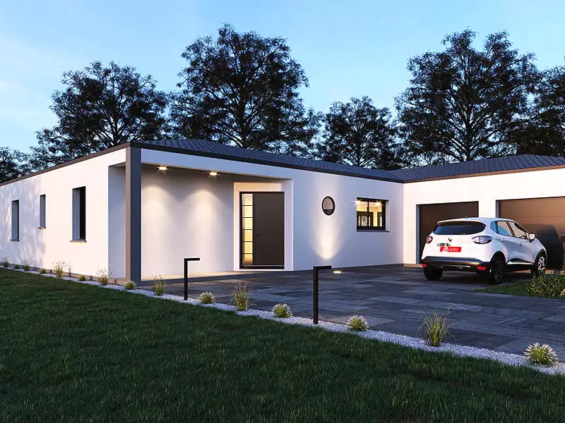 -------------------------------------------------------------------------------------------- Visuel d'illustration. Le modèle est totalement adaptable à vos envies et besoins et personnalisable grâce à de nombreuses options de finition. Nous consulter pour plus d’informations. Le prix affiché comprend le coût du terrain et de la construction hors frais de notaire et taxes. Les annonces de terrains constructibles sont sélectionnées auprès de nos partenaires fonciers selon disponibilités et autorisation de publicité en vue de construire une maison neuve avec un Contrat de Construction de Maison Individuelle dans le cadre de la loi du 19/12/1990. Ces derniers sont soit des professionnels dûment habilités à la transaction immobilière, soit des particuliers. Les terrains sélectionnés sont disponibles à la date de la première parution de l’annonce. En aucun cas Maisons ARLOGIS ou ses collaborateurs ne sont propriétaires des terrains, ne jouent un rôle d’intermédiation ou de négociation sur la transaction et ne participent à la vente. Prix indiqués par nos partenaires fonciers.