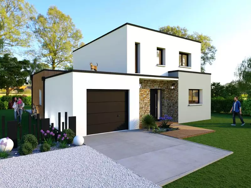 Nous vous proposons cette magnifique maison moderne et contemporaine avec toit plat (résistant à la grêle) et étage partiel imaginée par Maisons ARLOGIS Bordeaux constructeur de maisons individuelles sur-mesure :