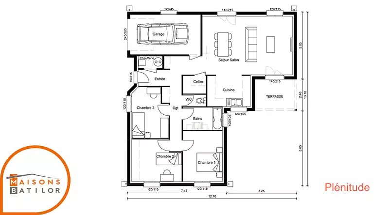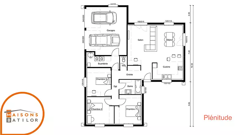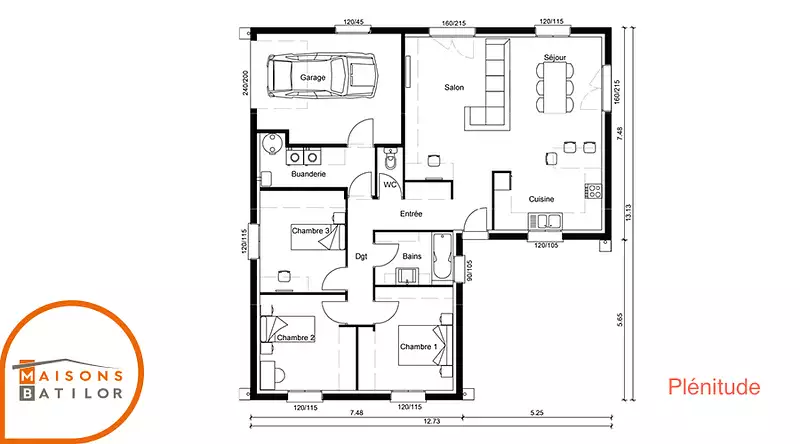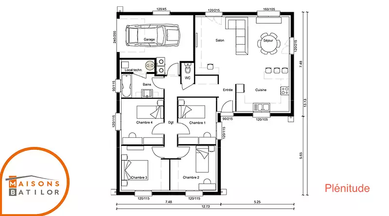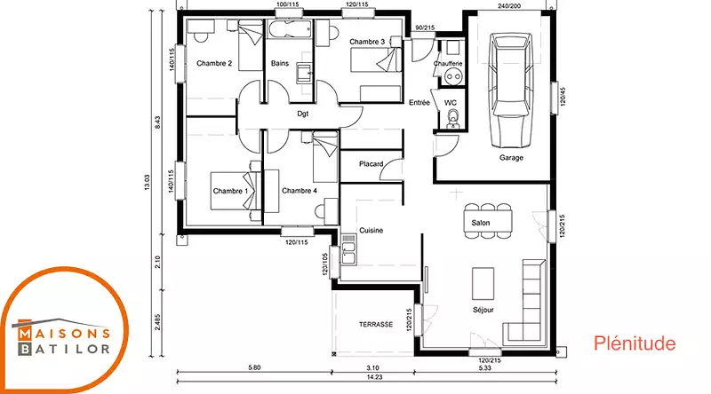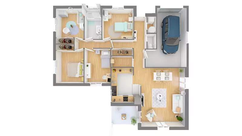 La Plénitude se distingue par son architecture en L, permettant une distinction naturelle entre l'espace jour et l'espace nuit, tout en restant sur un plan de plain-pied pour un confort optimal. Ce modèle comprend 4 chambres spacieuses, promettant intimité et tranquillité pour chaque membre de la famille, ainsi que 4 pièces bien agencées pour maximiser l'espace de vie commun.