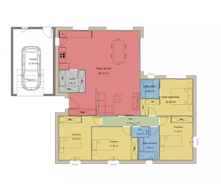Notre modèle se compose de 4 chambres, dont une suite parentale avec dressing et salle d'eau, offrant un grand espace de rangement pour vous simplifier la vie. Cet habitat de 114 m² habitable avec garage accolé de 21 m² réponds parfaitement à un mode de vie familial.
