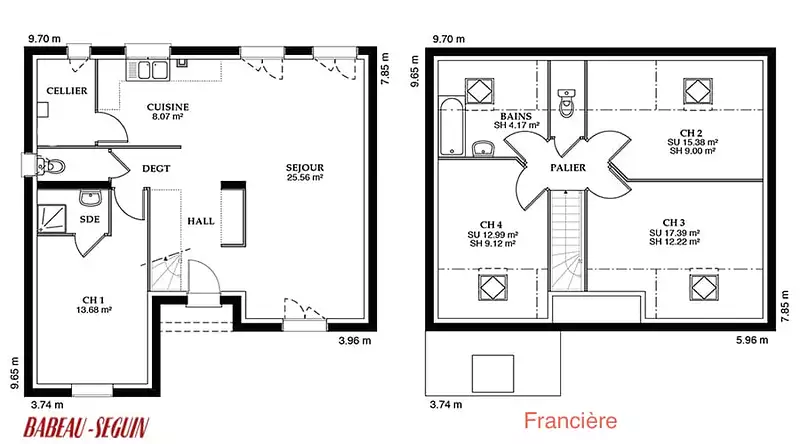 La Francière est une version à étage du modèle Francilière, enrichie d'un plancher béton et d'une charpente traditionnelle. Ses combles aménagés et sa dalle étage béton ajoutent à son charme et à sa fonctionnalité. Le décroché de toit sur la face avant de la maison la rend très attrayante et moderne, faisant d'elle une maison design par excellence.