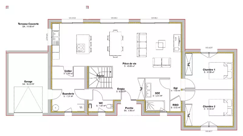 Sur ce terrain viabilisé et parfaitement situé, construisez la maison de vos rêves avec ce modèle de 145m2 habitable. Ce modèle de 145 m², chaleureuse et éco-responsable, vous offre 5 chambres spacieuses, 1 salle d'eau et 1 salle de bain, une grande pièce de vie lumineuse de 44m2 avec la cuisine attenante au cellier, une buanderie de 7m2! Une conception optimisée pour un confort maximal et une consommation énergétique réduite. Et pour votre confort un garage de 16,5m2, un porche d'entrée et une terrasse couverte de 14,5m2!