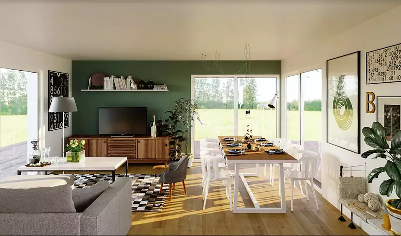 Vous avez la liberté de personnaliser cette maison en la décorant selon vos préférences et vos goûts. Exprimez votre style unique et créez un espace qui vous ressemble. Les conseillers de Maisons ARLOGIS sont à votre disposition pour vous guider dans ce processus et vous aider à réaliser la maison de vos rêves. Visuel d'illustration. Le modèle est totalement adaptable à vos envies et besoins et personnalisable grâce à de nombreuses options de finition. Nous consulter pour plus d’informations. Le prix affiché comprend le coût du terrain et de la construction hors frais de notaire et taxes. Les annonces de terrains constructibles sont sélectionnées auprès de nos partenaires fonciers selon disponibilités et autorisation de publicité en vue de construire une maison neuve avec un Contrat de Construction de Maison Individuelle dans le cadre de la loi du 19/12/1990. Ces derniers sont soit des professionnels dûment habilités à la transaction immobilière, soit des particuliers. Les terrains sélectionnés sont disponibles à la date de la première parution de l’annonce. En aucun cas Maisons ARLOGIS ou ses collaborateurs ne sont propriétaires des terrains, ne jouent un rôle d’intermédiation ou de négociation sur la transaction et ne participent à la vente. Prix indiqués par nos partenaires fonciers.