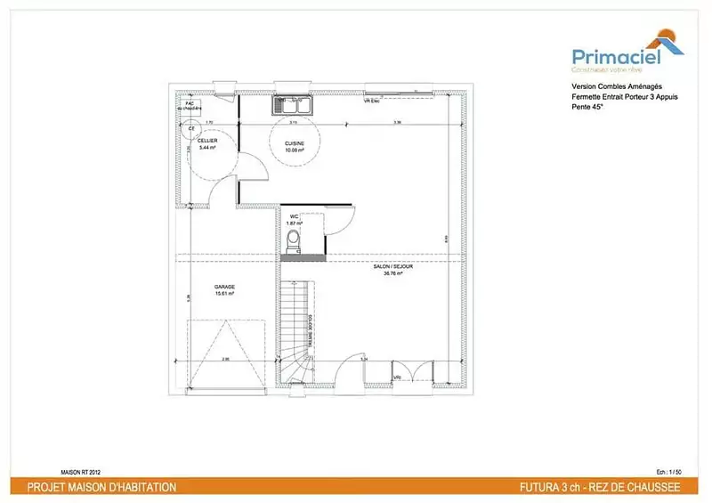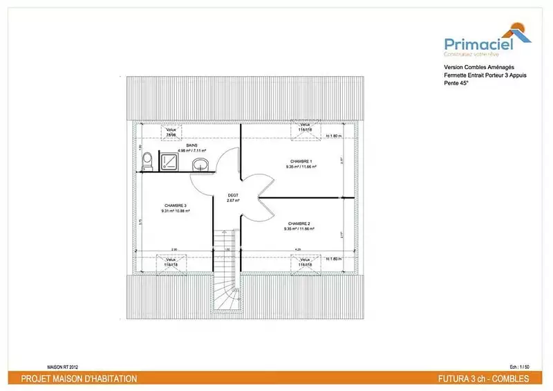 La Futura bénéficie d'une charpente fermette à entraits porteurs 3 appuis, avec une toiture à pente de 45°, et des combles aménagés, offrant ainsi un espace supplémentaire pouvant être personnalisé selon vos besoins et vos envies.