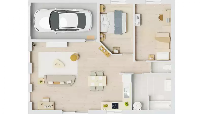L'extérieur n'est pas en reste avec un garage accolé, pratique et facilement accessible, ainsi qu'un auvent élégant, ajoutant une touche d'élégance à l'ensemble. Les options les plus plébiscitées, telles que les menuiseries en aluminium, l'enduit bi-ton et une pergola, sont disponibles pour personnaliser votre maison selon vos goûts et besoins, faisant de MALAITA un véritable cocon familial.