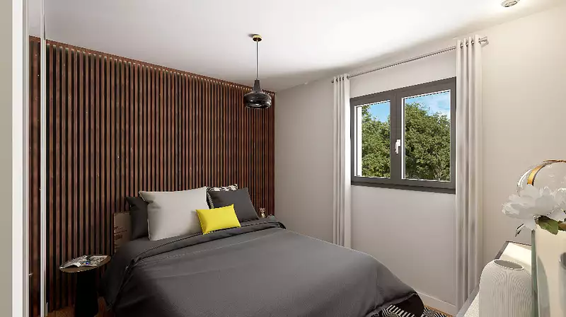 Cette maison dispose de quatre chambres, d'un espace de vie ouvert et lumineux, d'une salle de bains, d'un garage intégré de 15 m² avec un cellier attenant.