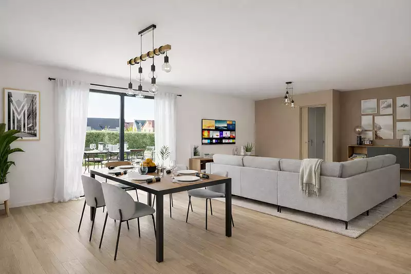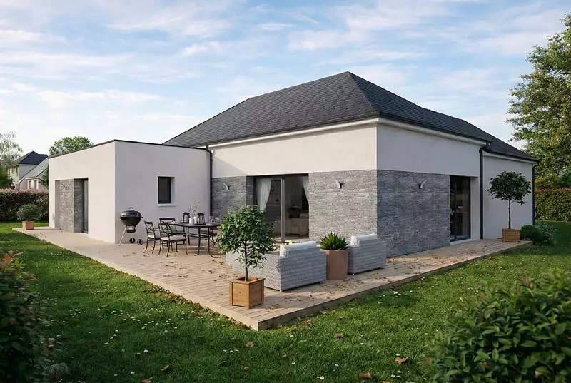 Un plan en L qui change tout !. Cette maison séduit au premier regard par son architecture en L, qui structure l’espace avec fluidité et caractère. L’espace de vie s’ouvre naturellement sur l’extérieur, baigné de lumière et prêt à accueillir vos moments de partage. Le coin nuit, bien séparé, propose 4 chambres confortables et deux salles d’eau pour une vie de famille tout en douceur. Le cellier attenant à la cuisine et le garage intégré ajoutent une touche de praticité au quotidien. Un modèle pensé pour s’adapter à toutes les envies, avec un vrai potentiel de personnalisation. . Pour un confort optimal et conforme à la RE2025, cette maison dispose d’une PAC avec plancher chauffant et volets roulants électriques. À noter : Le prix indiqué exclut les revêtements de sol des chambres, la cuisine aménagée, la peinture, la décoration, les raccordements, les frais de notaire et l’assurance dommages-ouvrage. .