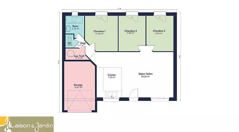 La Focus 75 se distingue par sa construction robuste en parpaings, gage de durabilité et de solidité. Son garage intégré de 15 m² offre non seulement un espace sécurisé pour votre véhicule mais aussi un espace de rangement supplémentaire, optimisant ainsi chaque mètre carré de la maison.