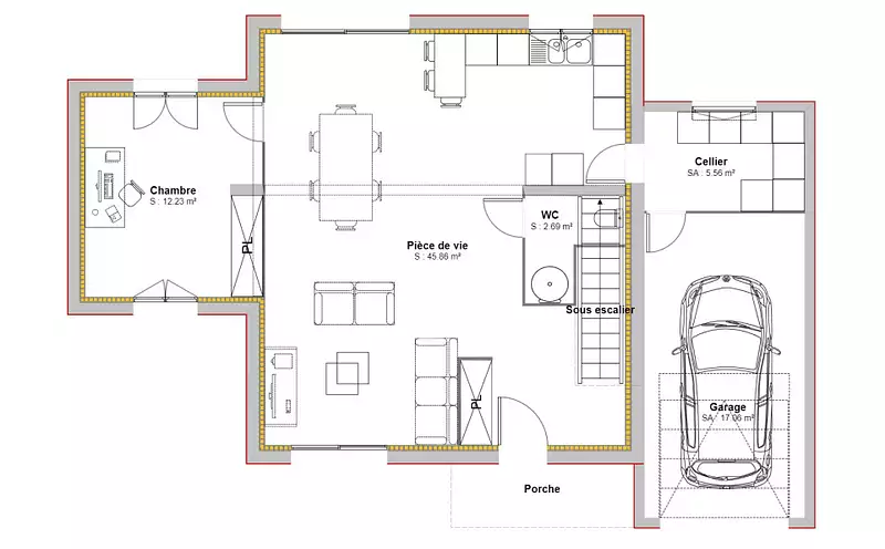 • Grande pièce de vie de 45m² avec cuisine ouverte sur le séjour, pour un espace convivial et lumineux