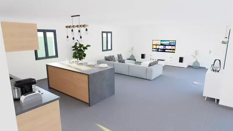 Ce modèle de maison est composé d'une grande entrée ainsi que d'un espace de vie spacieux avec cuisine ouverte sur le salon/salle à manger, d'un cellier et d'un WC indépendant.