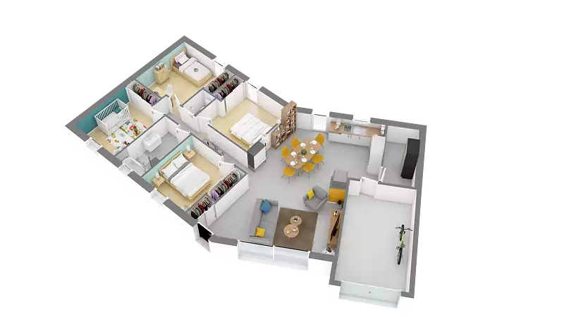 Du charme pour cette maison de plain-pied en V composée d'un très bel espace de vie lumineux avec cuisine US. Le plus pour cette maison est son garage intégré donnant accès au cellier et à la cuisine. Un dégagement dessert l'espace nuit qui vous offre 4 chambres avec rangements, une salle de bains et wc séparés. Pour vous assurer un confort de vie et conformément à la RE2025, nous avons choisi un mode de chauffage par PAC + plancher chauffant, volets roulants électriques. Prix hors fourniture et pose : des appareils sanitaires (sauf système de chauffage et d'eau chaude sanitaire), du carrelage et de la faïence, des revêtements de sol dans les chambres. Hors décoration et aménagement intérieur et peinture. Hors raccordements, frais de notaire et dommage ouvrage.