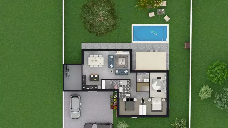 - Pièce de vie lumineuse ouvrant sur la terrasse et l'espace piscine (piscine non comprise dans le prix).