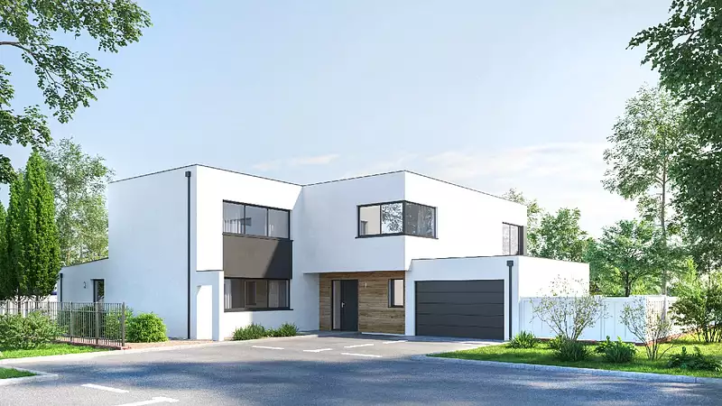 Superbe maison moderne à étage, la Louinium offre une surface habitable de 154 m² sur deux niveaux. La silhouette découpée de ce modèle contemporain à toit-terrasse, rehaussée par d’impressionnantes surfaces vitrées, en impose et charme immédiatement. Le revêtement extérieur bi-tons noir et blanc est très élégant.