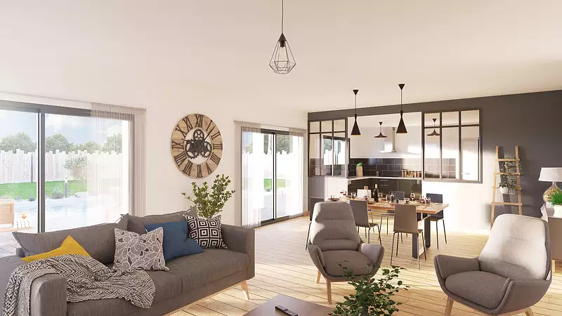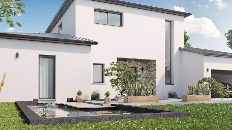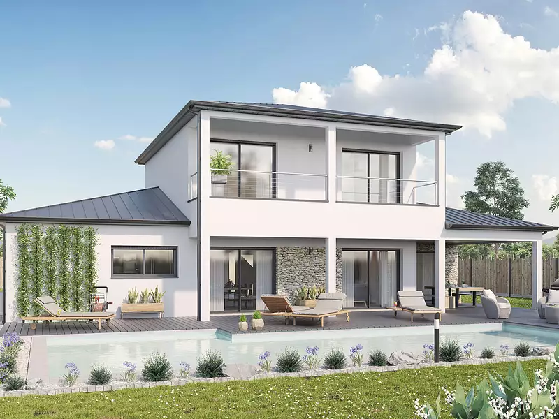 Une architecture qui allie élégance et fonctionnalité !. Laissez-vous séduire par cette maison contemporaine aux lignes épurées, où chaque espace est pensé pour optimiser lumière et confort. Avec 4 chambres, dont une suite parentale avec dressing et salle d’eau, ainsi qu’un espace de vie spacieux et convivial, elle répond aux attentes des familles modernes. Son design harmonieux intègre de grandes ouvertures sur l’extérieur, créant une connexion fluide entre intérieur et jardin. Fonctionnelle et personnalisable, elle s’adapte à votre mode de vie et vos envies. Un projet conçu pour s’intégrer parfaitement à votre terrain, alliant modernité et performance énergétique. Pour un confort optimal et conforme à la RE2025, cette maison dispose d’une PAC avec plancher chauffant au rez-de-chaussée, radiateurs à l’étage et volets roulants électriques. À noter : Le prix indiqué exclut les revêtements de sol des chambres, la cuisine aménagée, la peinture, la décoration, les raccordements, les frais de notaire et l’assurance dommages-ouvrage. (Piscine non contractuelle, non incluse dans le prix. ). Besoin d’inspiration ? Contactez-nous dès maintenant pour concrétiser votre projet !.