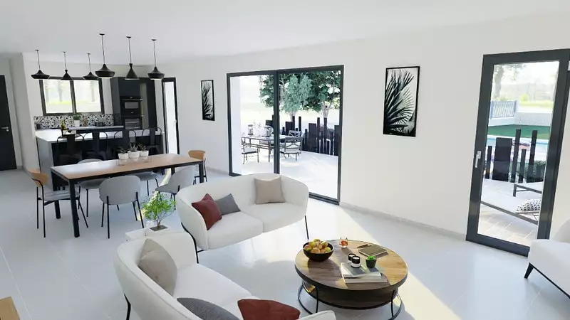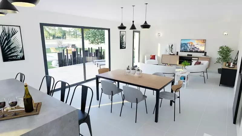 La pièce de vie de 50 m², spacieuse et traversante, accueille une cuisine ouverte et s'ouvre sur la future terrasse grâce à une grande baie vitrée coulissante et deux portes-fenêtres, créant une parfaite continuité entre intérieur et extérieur.