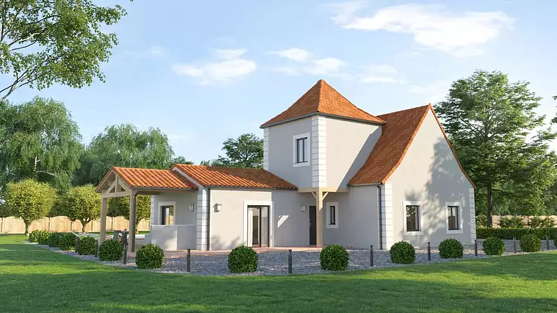 De l’extérieur, elle en impose ! Ses grandes façades en décalé surmontées de sa tour typique et son garage intégré contribuent à en faire une maison vraiment belle. Les pierres d’angles ajoutent une touche d’authenticité et de charme.