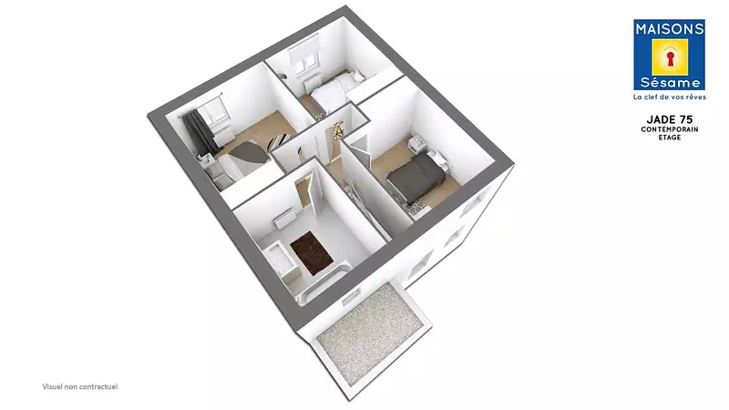 À l'étage, les trois chambres sont agencées pour offrir un cadre de vie intime et fonctionnel. Ce modèle est parfait pour ceux qui recherchent un design moderne tout en bénéficiant d’un aménagement pratique pour une vie familiale épanouie.
