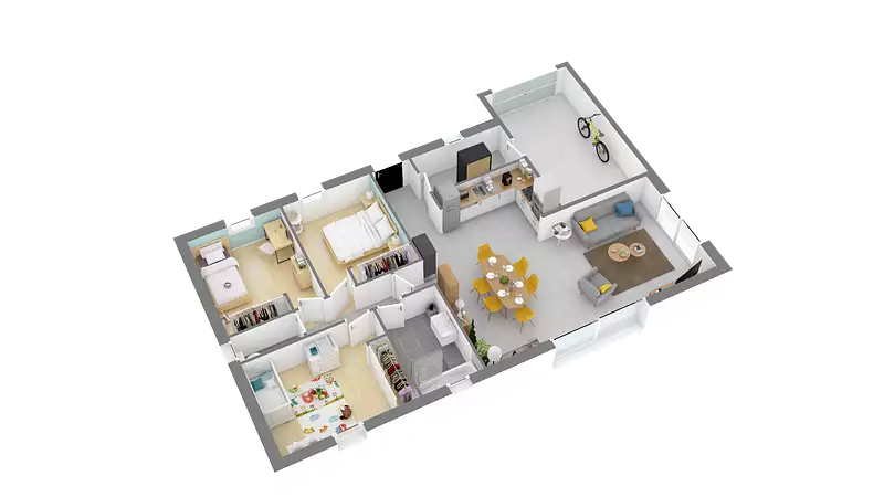 Agréable et spacieuse, cette maison de plain-pied vous propose une cuisine aménagée ouverte sur un vaste salon séjour donnant sur l'arrière. La cuisine est à proximité d'un cellier et d'un garage, ce qui facilite l'habitabilité de cette maison. L'espace nuit est composé de trois belles chambres avec rangement, d'une salle de bains équipée et des wc séparés. Ses jeux d'enduits personnalisables sauront vous séduirePour vous assurer un confort de vie et conformément à la RE2025, nous avons choisi un mode de chauffage par PAC + plancher chauffant, volets roulants électriques. Prix hors fourniture et pose : des appareils sanitaires (sauf système de chauffage et d'eau chaude sanitaire), du carrelage et de la faïence, des revêtements de sol dans les chambres. Hors décoration et aménagement intérieur et peinture. Hors raccordements, frais de notaire et dommage ouvrage.