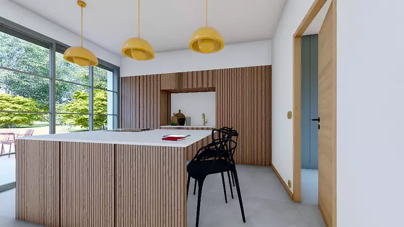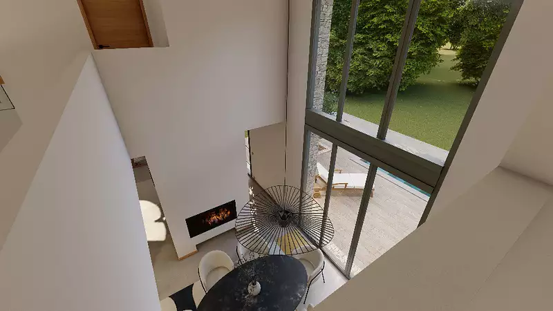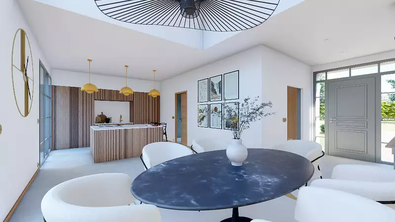 Dans l'espace de vie, la vaste pièce de vie baignée de lumière s'ouvre sur l'extérieur, idéale pour des moments de convivialité. La grandes baie vitrée, et le choix de matériaux haut de gamme créent une atmosphère à la fois chaleureuse et raffinée.