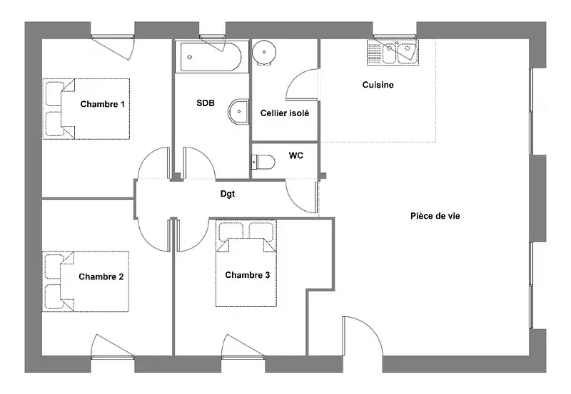 Proche de Saint-Brieuc - À découvrir à Langueux (22360) : maison neuve 4 pièces en vente. Surface de 80 m² sur 372 m² de terrain. Conçue de plain-pied, elle inclut trois chambres, une cuisine et une salle de bains.
