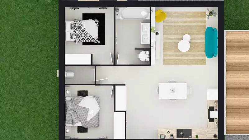 Maison de 64m² avec 2 chambres et une belle pièce de vie avec cuisine ouverte.